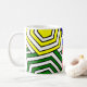 Diese Tasse hat ein Bauhaus-Design aus überlappenden, konzentrischen Hexagonen in Rot, Gelb, Blau und Grün.