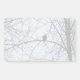 Ein Foto eines Bald-Adlers steht auf einem Baum-Ast, der die Gegend besichtigt. Das Bild wurde im Winter erstellt. Die Blätter haben die Bäume verlassen, und die Äste sind Ansammlung-Klumpen Schnee. Ein paar Schneeflocken fallen über den Hintern der Federn des Adlers. Der Himmel ist wolkenbedeckt. Image Copyright ©2021 Kimberly J Tilley.