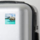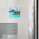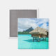 Souvenir Foto Magnet eines überwassergedeckten Hochzeitsdachbungalows in einem Resort in der türkisblauen Lagune der tropischen Insel Bora Bora mit Blick auf den Otemanu in der Nähe von Tahiti in Französisch-Polynesien.