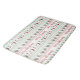 Eine Badematte mit sich wiederholenden Mustern im Hintergrund, in einem hässlichen Weihnachtspulli-Stil. Das Muster besteht aus Socken, Weihnachtsbällen, Sternen und Schneeflocken. Mit wiederholtem frohen Weihnachtstext in rot. Spaß und Feierlichkeit.