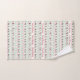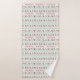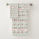 Handtuch-Set mit wiederholenden Mustern im Hintergrund, in einem hässlichen Weihnachtspulli-Stil. Das Muster besteht aus Socken, Weihnachtsbällen, Sternen und Schneeflocken. Mit wiederholtem frohen Weihnachtstext in rot. Spaß und Feierlichkeit.