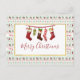 Ein Urlaub Gruß Postkarte mit einem sich wiederholenden Muster im Hintergrund, in einem hässlichen Weihnachtspulli Stil. Das Muster besteht aus Socken, Weihnachtsbällen, Sternen und Schneeflocken. Mit dem sich wiederholenden frohen Weihnachtstext in rot. Spaß und Feierlichkeit. Obergeschichtet ist ein weißes Rechteck mit einem Imitat goldenen Folie, innen ist eine Abbildung von altmodischen hängenden Strümpfen und der Text "frohe Weihnachten. Der Rücken hat eine Nachricht, die Sie personalisieren können.