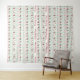 Ein großer Wandteppich mit einem sich wiederholenden Muster im Hintergrund, in einem hässlichen Weihnachtspulli-Stil. Das Muster besteht aus Socken, Weihnachtsbällen, Sternen und Schneeflocken. Mit wiederholtem frohen Weihnachtstext in rot. Spaß und Feierlichkeit.