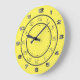 Römische und arabische Ziffern in den äußeren Ringen. Minute Hashmarken auf dem inneren Kreis. Zahlen in metallisch aussehenden silbernen Farben, Trennringe in dunkelgrau, alles auf einem fröhlichen gelben Hintergrund.