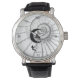 Männliche Uhr mit psychedelischem und mystischem Design. Das Zeitrad dreht sich und dreht sich unaufhörlich in einer Art "Memento Mori". Wir Zeitreisende reisen ständig zwischen Tag und Nacht. Eine elegante Armbanduhr, die Sie zur Meditation und zum Traum einlädt.