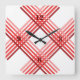 Rote Linien in fünf Farbtönen dunkel bis hell, von unten nach oben. Vier Sets Streifen werden diagonal platziert und bilden ein Quadrat in der Mitte, das rechtwinklig zu den Ecken des quadratischen Untersetzer. Dunkle Zahlen für 12, 9, 6 und 3.