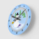 Der Schneemann schießt mit seinem Top-Hut auf den Schnee. Kiefernbäume sind im Hintergrund. Der 3D-Globus hebt sich vor der Hintergrundfarbe (Sie können die Uhr anpassen/bearbeiten) der Uhr ab.