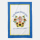 Farbenfrohe Küchentücher Design im Zentrum Volkskunst Stil ukrainische Mädchen in traditionellen Kostümen mit großen Sonnenblumenkranz und der nationalen Jubel "Ruhm an die Ukraine! Ruhm den Helden!" auf Englisch und Ukrainisch. Farbgrenzen für die blaue und die gelbe ukrainische Flagge
