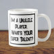 Ein lustiger Slogan auf einer Coffee Tasse, der sagt: "Ich bin ein Ukulele Player. Was ist DEIN super Talent?" Tasse für einen Ukulele Player oder jemanden, der die Ukulele spielt. Schwarzweißtext.
