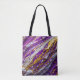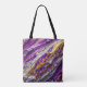 Ein abstraktes Design in Lila, Gold und Weiß, das raues Gelände nachahmt, ziert diese Umhängetasche.
