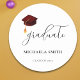 Einfache und moderne Skript Abschluss Umschlag Aufkleber, um Ihren Abschluss Schreibwaren Ankündigung und Party Umschläge hinzuzufügen. Das elegante Skript mit dem Wortgraduierten wird mit einem Serif-Schriftart begleitet, den Sie bearbeiten können, um den Namen Ihres Absolventen und das Klassenzjahr hinzuzufügen. Um eine Touch Farbe hinzuzufügen, gibt es eine Abbildung eines Mond- und Goldgraduierungspapiers. Illustriert und entworfen von Patricia Alvarez.
