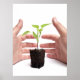 Zwei Hände schützen eine junge Pflanze, die aus einem Bodenkumpen wächst