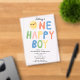 Un beau dessin d'invitation de soleil dessiné à la main. Une mignonne invitation à la fête du premier anniversaire "One happy boy". Un beau thème d'invitation d'anniversaire de soleil d'été qui peut être customisé à vos détails.