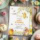 Un doux thème d'anniversaire avec des abeilles, un pot de miel, une ruche, et des fleurs jaunes à l'avant et à l'arrière ! Vous pouvez personnaliser cette invitation avec vos propres détails.