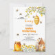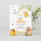 Un doux thème d'anniversaire avec des abeilles, un pot de miel, une ruche, et des fleurs jaunes à l'avant et à l'arrière ! Vous pouvez personnaliser cette invitation avec vos propres détails.