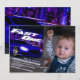 Démarrez vos moteurs et foncez vers la ligne d'arrivée pour célébrer le 1er anniversaire de votre bébé. Cette invitation unique a été dessinée numériquement pour illustrer une voiture de sport très rapide lors d'un concours de course de rue nocturne où personne ne peut suivre