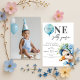 l'histoire d'un jalon joyeux - tout premier anniversaire, une célébration enveloppée d'amour, de chaleur et d'une touche de fantaisie. Le design s’articule autour d’une oie charmante, joliment illustrée comme s’il était tiré des pages d’un livre pour enfants bien-aimé. Il n’est pas n’importe quelle oie, il est "une oie idiote", habillé pour une fête dans une couronne rayée casquette et fleurie, accrochant fièrement un ballon bleu. Son expression est pleine de vision, innocente et pleine de personnalité, comme celle d'un enfant d'un an qui découvre le monde.