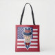 Tote Tasche mit einer Illustration von Uncle Sam mit der amerikanischen Flagge als Hintergrund, 4. Juli patriotische Design von Maxi Harmony / Radka Kavalcova, rote Version