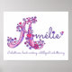Joli poster avec monogramme et nom artistique parfait pour la chambre ou la salle de jeux d'une fille dans des tons de blanc, rose et violet. Personnalisez avec le nom de votre enfant commençant par A, et la signification du nom pour un effet vraiment personnalisé dans la chambre ou la nurserie de votre enfant, cet exemple est pour le nom Amélie Travailleuse, travailleuse acharnée, intelligente et ambitieuse. Jolie impression idéale pour un nouveau-né, un baptême ou un cadeau de baby-shower. © Monogramme unique cœurs et fleurs dessin description et conception graphique par Sarah Trett. www.sarahtrett.com pour www.mylittleeden.com