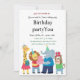 Cette carte d'invitation d'anniversaire joyeuse présente des animaux de dessin animé adorables — une girafe, un lion, un éléphant et un singe — tous habillés pour une fête et tenant des cadeaux colorés. Avec des couleurs vives et une ambiance festive, c'est parfait pour inviter des amis à une célébration d'anniversaire amusante et joyeuse.
