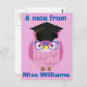 Cette carte postale est idéale pour envoyer aux parents quand un élève mérite des éloges ! Parents et étudiants apprécieront cette carte personnalisée. Doté d'une conception de chouette violette. Cliquez sur Customiser pour changer le nom de l'enseignant.