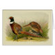 Dessin coloré d'un coq étranglé de faisan d'anneau regardant au-dessus de sa poule tandis qu'elle picote pour des graines dans le dédouanement d'une prairie remplie par herbe. Le coq est un arc-en-ciel de couleurs comprenant vert, jaune, des oranges, des bleus, des bruns et des blancs. Un joli gibier à plumes de montagne.