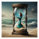 Belle sirène à l'intérieur d'un sablier observant les mouettes voler sur une plage à côté de l'océan