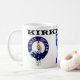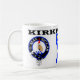 Une tasse Kirkpatrick avec le badge Kirkpatrick en deux langues différentes.