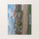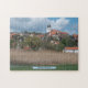 Stehend auf einem Gebiet in der ungarischen Landschaft, die Steeples und die Gebäude einer Stadt betrachtend. Wolken sind im blauen Himmel, aber das Wetter bleibt sonnig und warm.