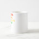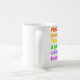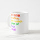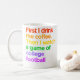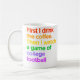 Das Coffee Tasse Design Sprichwort "Zuerst trinke ich den Kaffee. Dann schaue ich mir das Uni Football Spiel an" ist weiß mit rot, orange, gelb, grün und blau.