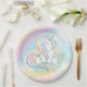 Eingedeckte Baby-Duschpapier-Teller mit bezauberndem Einhorn auf einem wunderschönen, pastellfarbenen Regenbogen und Wolkenuntergrund. Diese niedlichen Einhorn-Teller sind leicht mit Text versehen. Sie können auch die Hintergrundfarbe ändern.