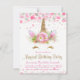 Invitations à la fête d'anniversaire de la licorne avec mignon visage de licorne rose avec des cils dorés souriants et corne fleurie sur un élégant arrière - plan pastel confetti bulle. Cette mignonne invitation de fête d'anniversaire à la licorne est facilement customisée pour votre événement en ajoutant simplement vos détails. Vous pouvez également changer la couleur de l'arrière - plan et enlever l'arrière - plan à l'arrière sur cette mignonne invitation à la licorne. Il s'agit d'un dessin imprimé sans véritable parties scintillant.