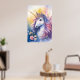 Poster eines majestätischen Einhorns mit einem goldenen Horn, umgeben von pulsierenden Blume. Seine Mane fließt in lila, rosa und blauen Farbtönen und fügt sich nahtlos in eine weiche, traumhafte Kulisse ein.