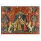 Die Dame and The Einicorn, ein mittelalterlicher Wandteppich aus dem Jahr 1500, gehört zu einem Set französischer Wandteppiche, die als große Kunstwerke aus dem Mittelalter angesehen werden. Diese Dame und die Unicorn-Tapete sind ein atemberaubendes Bild einer Dame, die in einem Zelt stehend ist, mit einem Einhorn auf der einen Seite und einem Löwen auf der anderen Seite. Ein kleiner weißer Hund sitzt neben ihr auf einer Bank, und ein Handmädchen auf der anderen Seite. Der Hintergrund der Tapisserie ist ein rotes Feld von Blume und Tieren, darunter Hunde, Kaninchen und Vögel. Die ursprüngliche mittelalterliche Unicorn-Tapete war ziemlich beschädigt und verlor viel von ihrer ursprünglichen hellen Farbe und Qualität. Während wir einige der originalen mittelalterlichen Rot- und Blautöne der Unicorn-Tapisserie wiederherstellen konnten, beachten Sie bitte, dass das Bild noch immer nicht perfekt ist. Aber unsere ist eine einzigartige Version dieses mittelalterlichen Wandteppichs, da wir ihn erweitert und erweitert haben, um seine ursprüngliche Schönheit zu zeigen.