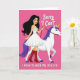 This greeting card shows a stylish young woman with long raven hair striding across a bright fuchsia background as she leads a calm white unicorn, and the two look like an inseparable pair. She wears a strapless white ruffled dress paired with crimson high-heeled boots, giving her a confident, date-night-meets-adventure look. A thin red leash runs from her hand to the unicorn, like a gentle link between friends who trust each other. The unicorn’s mane and tail are rich purple, and its horn gleams gold, adding a little magic to the otherwise flat, cartoon-like colors. At the top, the phrase “Sorry I Can’t” appears in white lettering, centered and easy to spot against the pink field. Along the bottom, “I Have To Walk My Unicorn” is also set in white, balancing the layout and framing the pair with a cheeky message 💚. The figures are outlined with strong, simple lines and minimal shading, with the purple hair, gold horn, and red boots standing out sharply on the fuchsia backdrop ☘️.