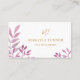 This unique business card features a botanical design of purple watercolor leaves paired with stylish gold script typography.