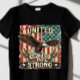 Hier ist Ihr aktualisiertes rustikales Vintag-Style-T - Shirt-Design mit einem steilen Adler mit einer alten amerikanischen Fahne und der Phrase "United & Strong" 🦅 🇺 ✨.