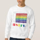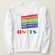Das Sweatshirt zeigt eine originale Marker-Abbildung eines in Regenbogen gestreiften Lagenkuchens, mit UNITY in einem kühlen Regenbogen-Schriftart.