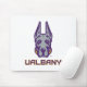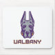 Das Maskottlogo der Universität Albany Great Dane zeigt eine stilisierte Darstellung des Kopfes eines großen Dänen. Der Hund ist illustriert mit scharfen, kühnen Linien in lila und grau, was ihm einen erbitterten, selbstbewussten Ausdruck verleiht. Die Ohren stehen hoch und symbolisieren Aufmerksamkeit und Stärke. Unter dem Kopf der Großen Däne steht das Wort "UBAlbany", geschrieben in fett gedruckten, blockigen goldenen Briefen, die lila umrissen wurden, was das Markenzeichen der Universität verstärkt. Dieses Design repräsentiert die Sportteams von UAlbany und unterstreicht Power, Loyalität und Entschlossenheit.