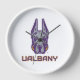 Das Maskottlogo der Universität Albany Great Dane zeigt eine stilisierte Darstellung des Kopfes eines großen Dänen. Der Hund ist illustriert mit scharfen, kühnen Linien in lila und grau, was ihm einen erbitterten, selbstbewussten Ausdruck verleiht. Die Ohren stehen hoch und symbolisieren Aufmerksamkeit und Stärke. Unter dem Kopf der Großen Däne steht das Wort "UBAlbany", geschrieben in fett gedruckten, blockigen goldenen Briefen, die lila umrissen wurden, was das Markenzeichen der Universität verstärkt. Dieses Design repräsentiert die Sportteams von UAlbany und unterstreicht Power, Loyalität und Entschlossenheit.