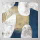 Eine große abstrakte Form in marineblau bedeckt den Rand der Leinwand bis zum Rand, wobei Ausschnitte einen texturierten, weißen Hintergrund ergeben. Ein abgenutzter, strukturierter beigefarbener Bereich sitzt über der blauen Form, weiße Linien Drehung wie Seil in einem dynamischen Finish zum Stück.