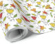 Unrolled and flat sheets of floral wrapping paper with a colorful pattern of red, yellow, and green leaves on a white background.