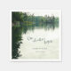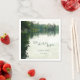 Für Ihre Hochzeitsfeier am See oder am Flussufer bietet dieses rustikale "Unser Abenteuer beginnt" Hochzeitsempfang-Servietten, die aus meinem persönlichen Kajakfoto entstanden sind und mit einem subtilen digitalen Aquarelleffekt und typografischen Elementen ausgestattet sind, eine wunderschöne Naturszene unter einem bewölkten Himmel mit leicht gewachstem, aber ruhigem Wasser, das entfernte Evergreens, Zederbäume und Felsstrukturen reflektiert ynes