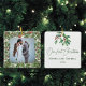 Elegante Weihnachtsschmuck und Sake für Neuvermählte. Auf der einen Seite ein beliebtes Hochzeitsfest, umgeben von Weihnachtsblättern, mit Aquarellmalerei und "Unser erstes Weihnachten" in Kalligraphie-Schrift, die mit Ihren Namen und Hochzeitsjahr (oder Hochzeitstag) auf der anderen Seite personalisiert werden kann.
