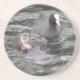 Dieser hübsche Sandstein-Untersetzer zeigt ein Foto von einem Coot und ihrem Küken, das auf einem Flussufer schwimmt. Das Weibchen ist grau mit einem weißen Pflaster auf dem Kopf und roten Augen, während das winzige, flauschige Küken mit einer weißen Vorderseite blassgrau ist.