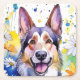 Digitales Kunstbild eines fröhlichen deutschen Schäferhundes, umgeben von lebhaften Blume und Farbspritzen. Der fröhliche Ausdruck wird durch den lebendigen Hintergrund ergänzt, der eine skurrile und lichtdurchflutete Szene schafft.
