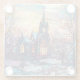 Ein bezaubernder Untersetzer aus Glas mit dem Bild einer Winterkirche im Buntglasstil.