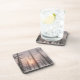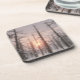 Eine blasse Wintersonne Set hinter mächtigen Lärchenbäumen wie dunkle Sentinels. Ihre versteinerten Zweige, nackt, außer einer Beschneiung von Schnee, und die pastellfarbenen Golden, Pinks und Blues des Sonnenuntergangshimmels werden als durch einen traumhaften Dunst angesehen. Im Vordergrund fallen sanft Schneeflocken.