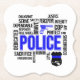 Diese Untersetzer haben das Wort "Polizei" in blau, zusammen mit mehreren Worten, die beschreiben, was ein Polizeibeamter ist und tut. Das wäre großartig für ein polizeiliches Party oder ein Party für jemanden, der die Polizeiakademie oder irgendeine Polizeiakademie abschließt.
