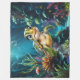 Unterwasserabenteuer mit der fröhlichen Schildkröte. Das Design besticht durch eine charmante Cartoon-Schildkröte, die elegant durch ein lebendiges Korallenriff schwimmt. Die Schildkröte hat eine hellgrüne Muschel mit spielerischen Motiven und eine hellgelbe Unterseite, die im Wasser glänzt. Große, ausdrucksstarke Augen verleihen ihm einen freundlichen und seltsamen Ausdruck. Das Korallenriff ist reich an farbenfrohen Korallen verschiedener Formen und Größen und strahlt in lebhaften Farben wie Rot, Orange, Rosa und lila aus. Zahlreiche Fischarten in fröhlichen Farben schwimmen zwischen den Korallen.